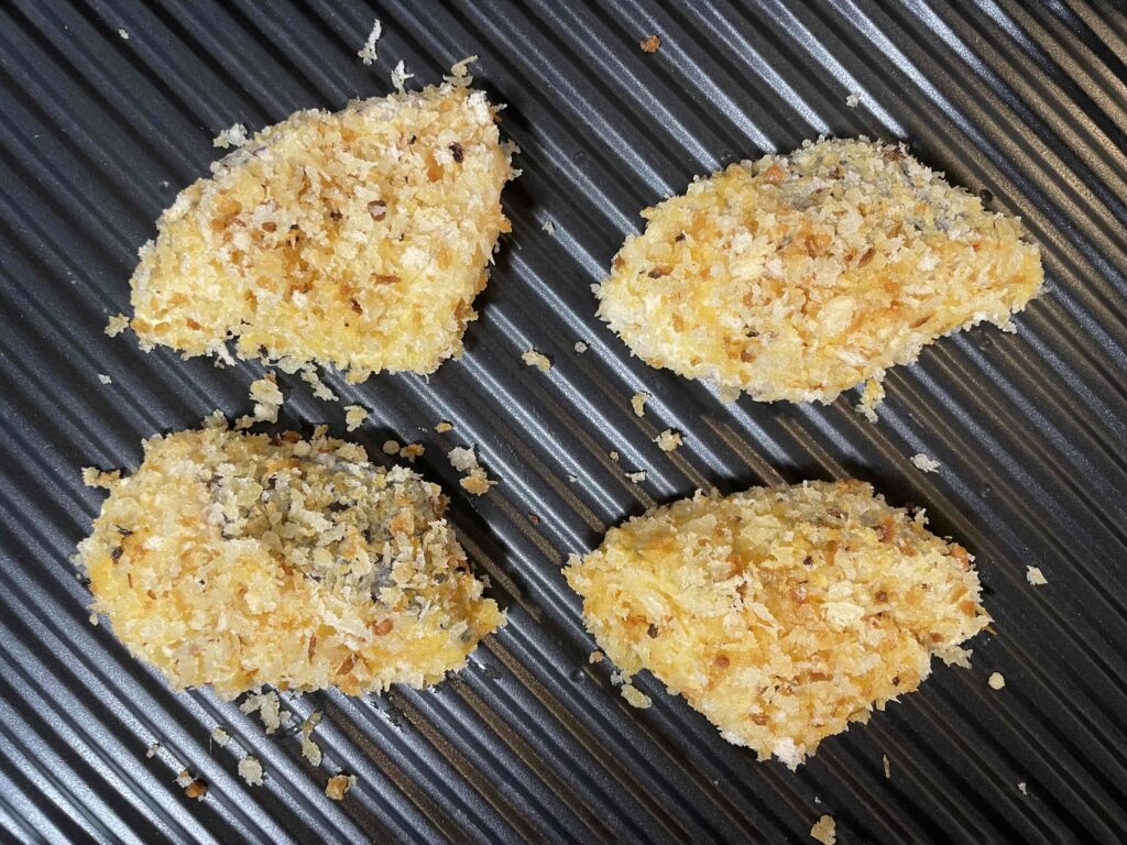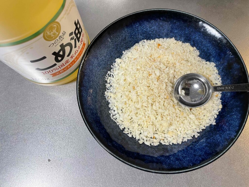 下準備として、パン粉に油を混ぜ合わせ、ラップをしてからレンジで2分加熱してください。若干きつね色になると思います。