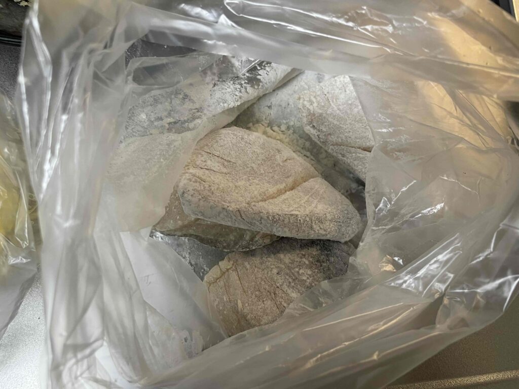 タラは空気を含ませながら、袋を閉じて振ると、満遍なく小麦粉がつきます。