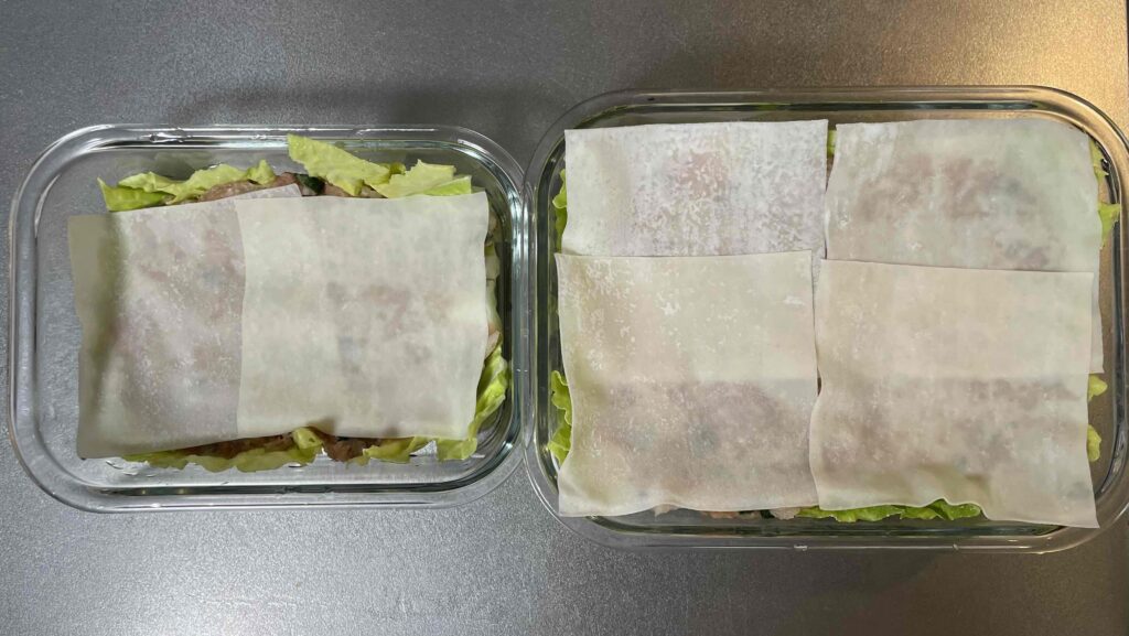 ※小さい容器は子供たちの分です。1段で作りました。(食べやすさを重視して白菜を細切りにしても良かったかなと思いました。)