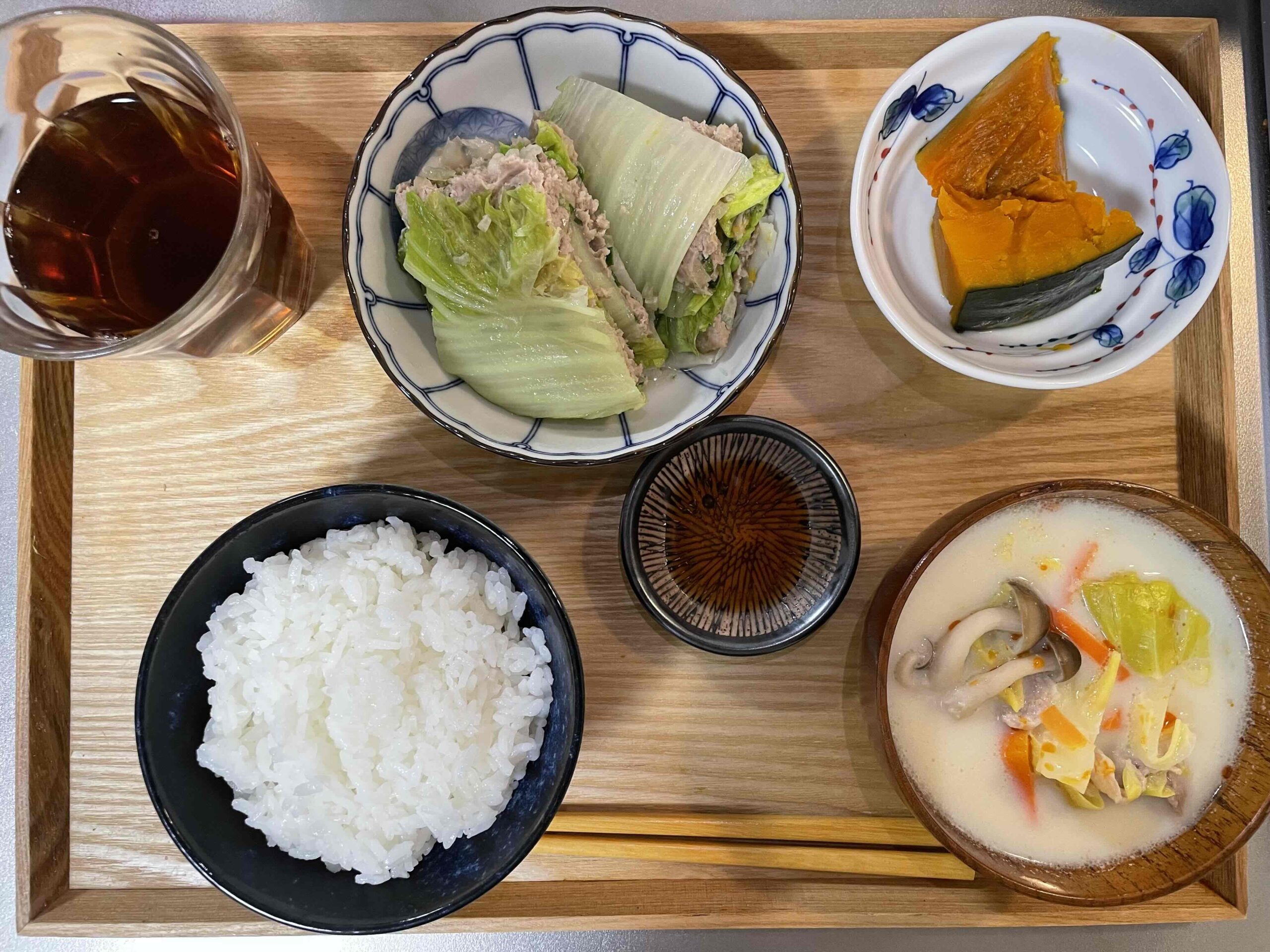 メインがレンジで蒸しただけの料理で、ややヘルシーです。エネルギーをもう少し欲しいかも?と思い、副菜にかぼちゃの煮物をつけました。