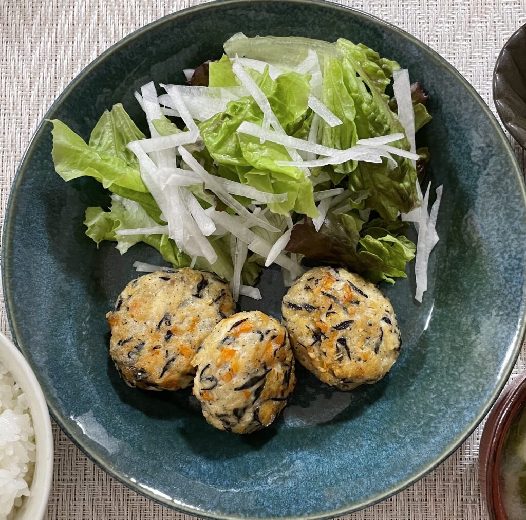 ・鶏挽肉90g・絹ごし豆腐(水切り)70g・しらす10g・人参16g・エノキ10g・ひじき(戻し済)16g・ごま2.5g・薄口醤油2.8g・酒4g・片栗粉7g・揚油(適宜)