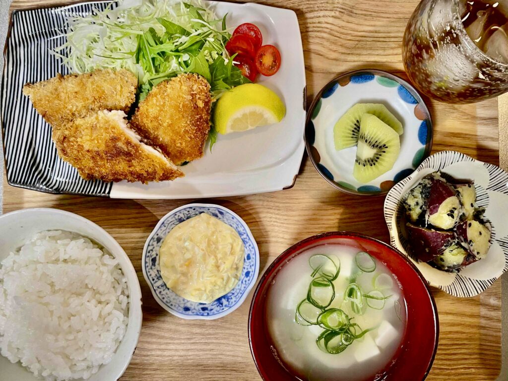 ポイント1:揚げ物は衣と揚油の使用によりエネルギーが高くなりがちです。そのため、マヨネーズ使用で脂質が多いタルタルソースや炭水化物の多いさつまいもの摂取を控えることが簡単にエネルギーを減らせるコツです。