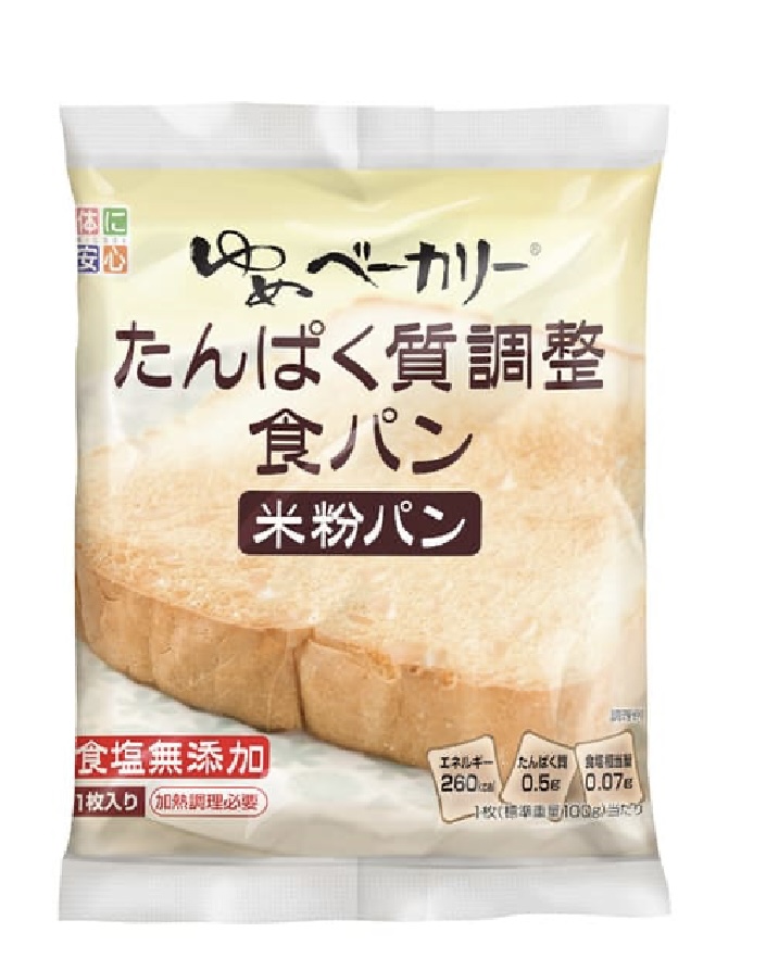 →普通の食パンとカロリーはそれほど変わらず、たんぱく質も塩分もグッと抑えてくれます。主食からのたんぱく質摂取を減らすことで、副食(おかず)のたんぱく質を多く食べることができます。