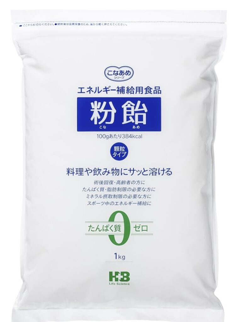 →エネルギー補助用食品の砂糖です。普通の砂糖と同じエネルギー量ですが、甘くありません。そのため、料理や飲み物にたくさん入れて食品をエネルギーUPさせることができます。たくさん入れてもほとんど味は変わらないです。そして溶けやすいです!
