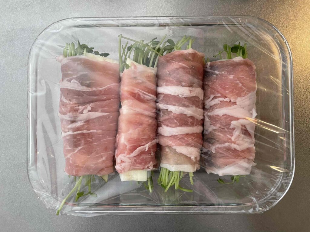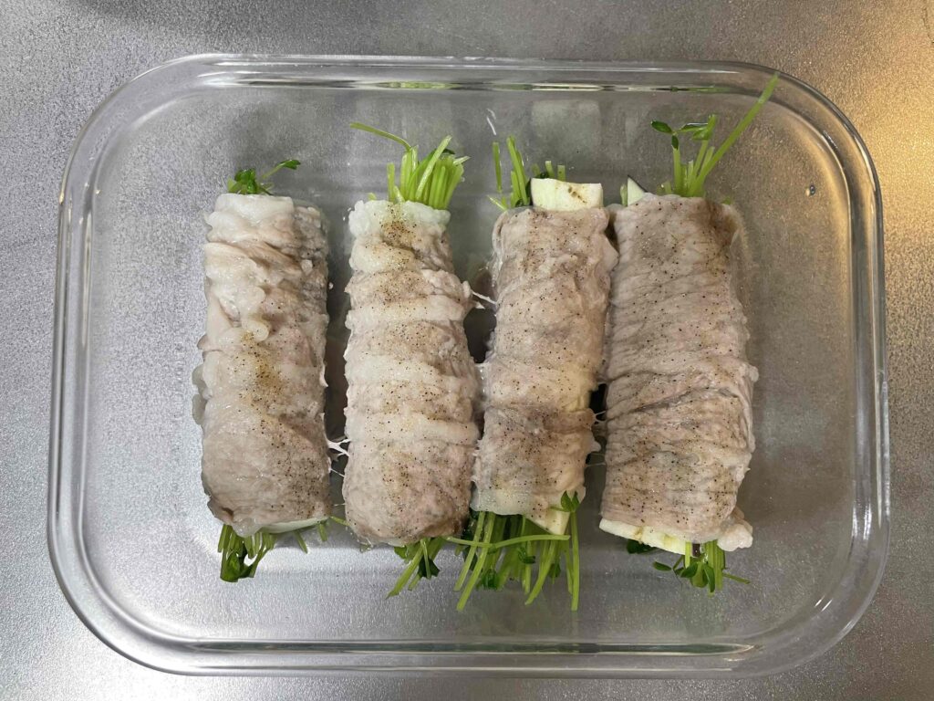 〈豆苗と茄子の豚肉巻き/耐熱容器1つ分〉