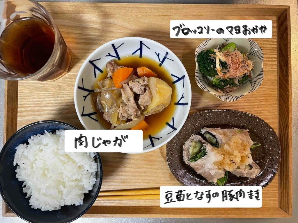 本日のメインは肉じゃがです。煮物料理の時は汁物は極力避けて、塩分の摂りすぎにならないよう気をつけています!