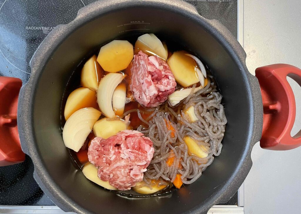 ①好みの大きさに切った食材、調味料を全て圧力鍋に入れます。